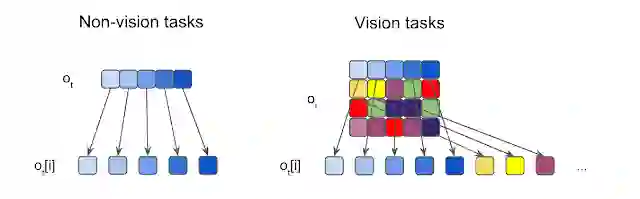 观察分割的图示。我们将每个输入分割成元素,然后将这些元素馈送到独立的感觉神经元。对于非视觉任务,由于输入通常是一维向量,所以每个元素都是一个标量。对于视觉任务,我们将每个输入图像裁剪成不重叠的图块