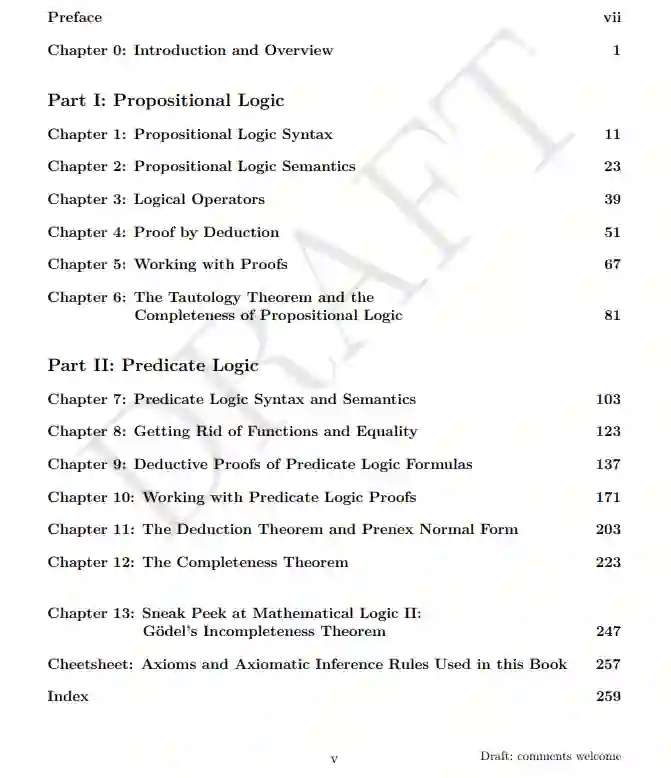 本文采用一种独特的教学方法,通过引导学生通过Python编程实现基本的逻辑概念和数学证明来介绍数学逻辑。这种方法专为日益增长的精通编程的学生量身定制的独特直觉和优势,将数学逻辑带入这些学生的舒适区,并提供了只有通过深入的动手理解和创建工作代码的满足感才能实现的清晰。虽然方法是独特的,文本遵循相同的主题集通常涵盖在一个学期的本科课程,包括命题逻辑和一阶谓词逻辑,最终证明Gödel的完整性定理。还提供了Gödel的不完备性定理的预览。该教材附有大量编程任务、代码框架和单元测试的集合。假定您熟悉证明并基本精通Python。