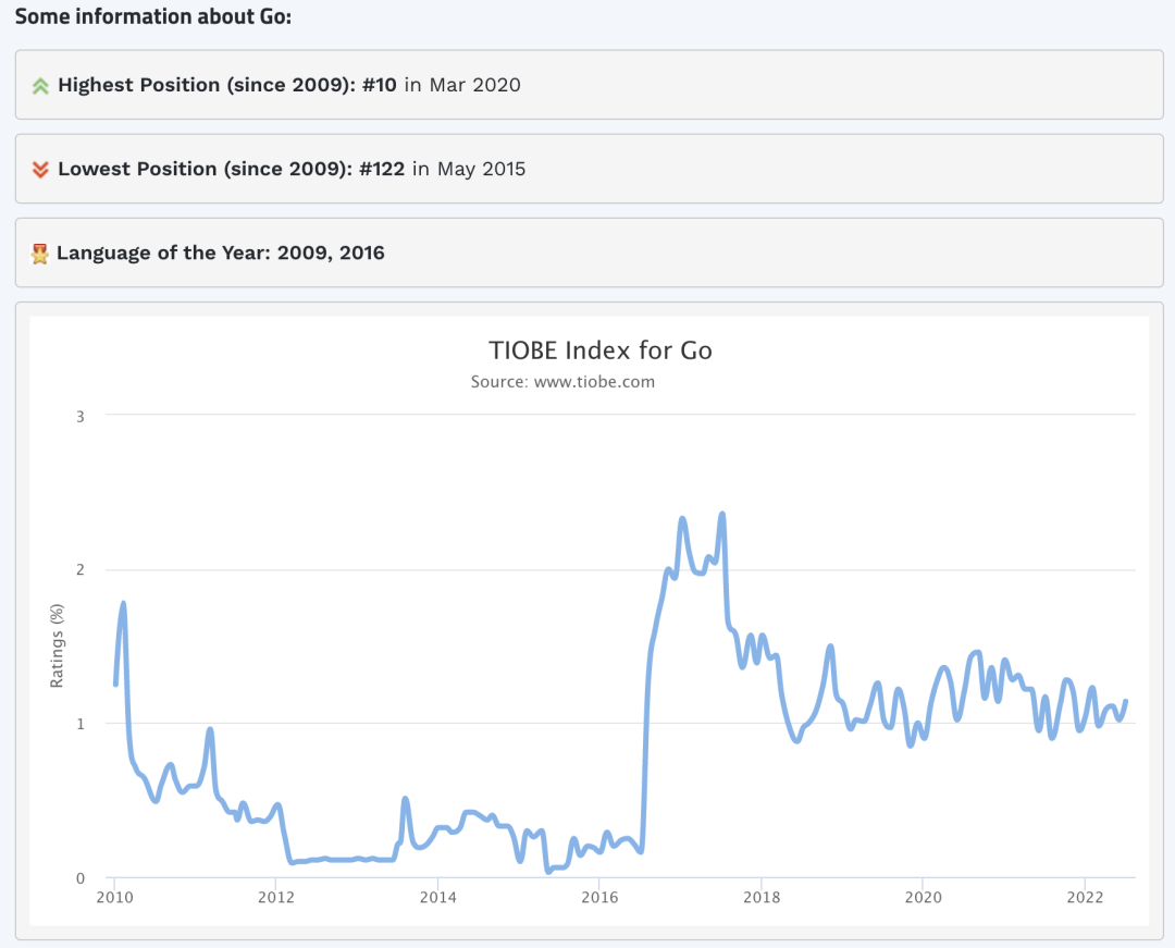 从 TIOBE Index 对 Go 语言的使用情况统计来看,Go 语言近几年的发展是比较稳定的。