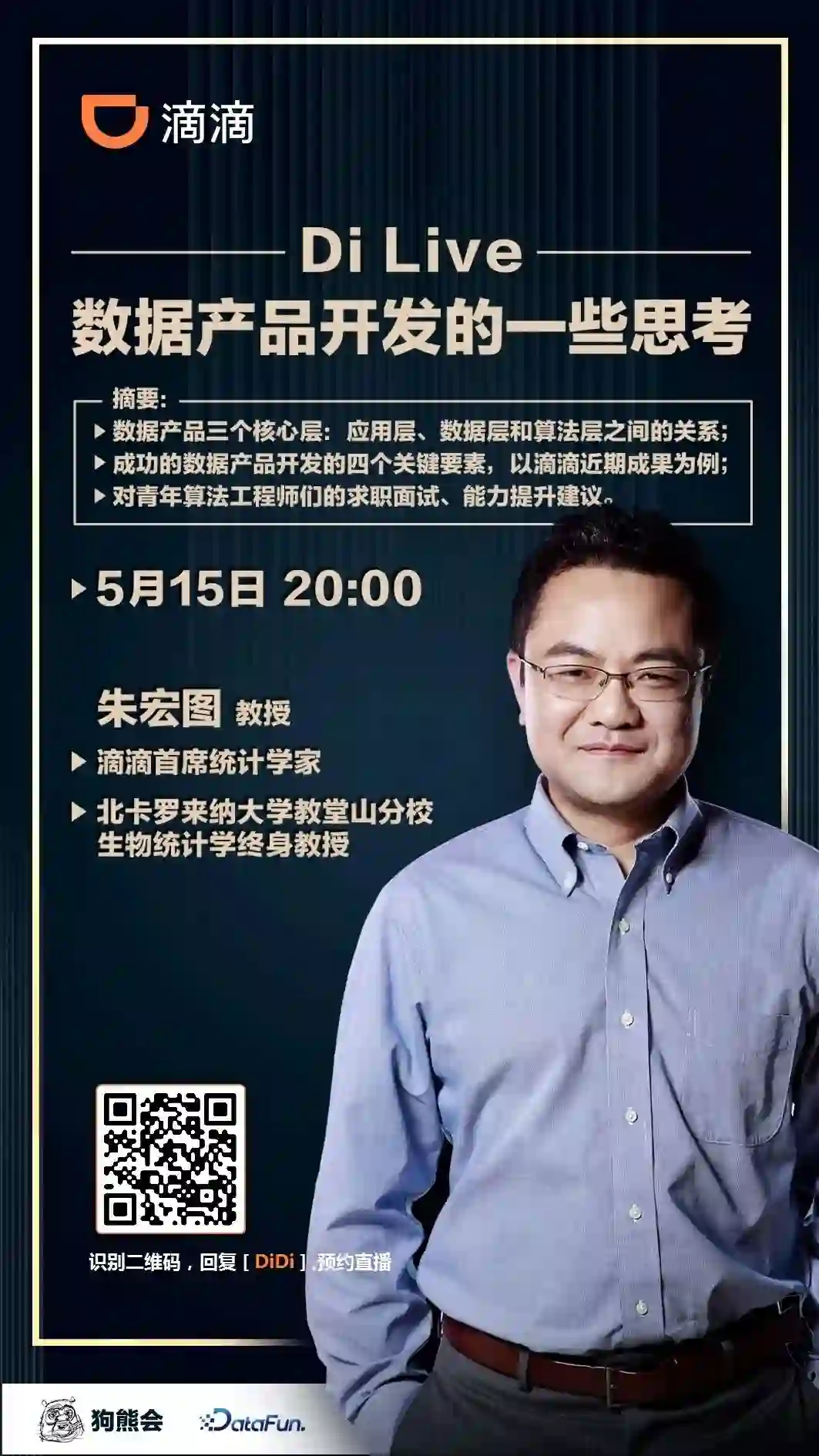 5月15日(周五)晚20点,滴滴首席统计学家朱宏图教授开讲,深入浅出分享数据产品的三个核心层:应用层、数据层、算法层之间的关系,及数据产品开发的四个关键要素,精彩内容不容错过!