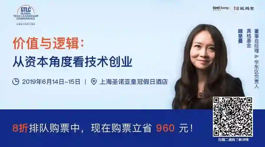 干货还没看过瘾?没关系,6 月 14—15 日,上海,真格基金董事总经理 & 华东区负责人顾旻曼将降临 GTLC 全球技术领导力峰会,与参会者分享《价值与逻辑:从资本角度看技术创业》主题演讲。