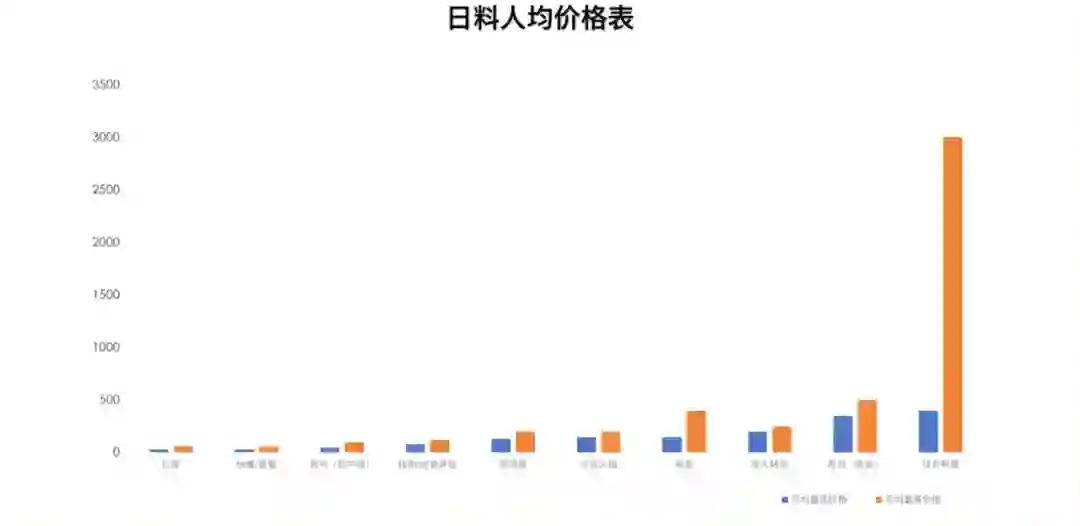 从图上可以看出,低端日料包括快餐简餐、拉面、定食等,价格在人均50-100元;中端日料包括寿司、刺身、居酒屋等,人均100-300元;高端的是怀石料理,定价跨度很大,从400-3000元不等。