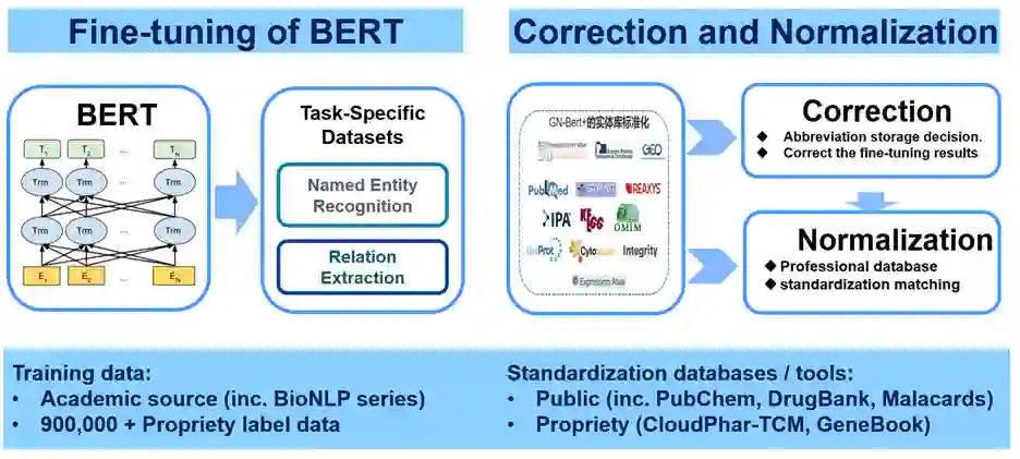 该数据库全部是由各领域专家手动标记。同时,团队还拥有自开发的标记数据,特别是针对中文的、中医药相关的,以及一些补充数据。然后,团队从基础 BERT 预训练模型(基于英文维基百科和 BooksCorpus)开始,针对实体识别任务进行 fine-tuning。