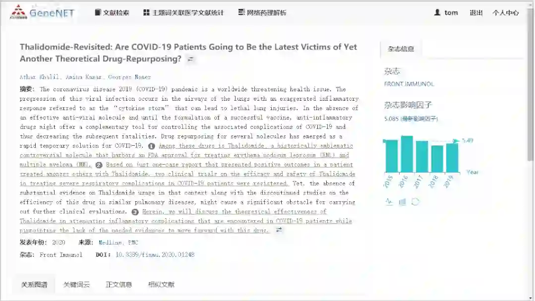 点击进入某篇文献后,会有知识图谱显示,并且与文本标记可交互访问,同时还有词云显示、相似文章推荐等功能。