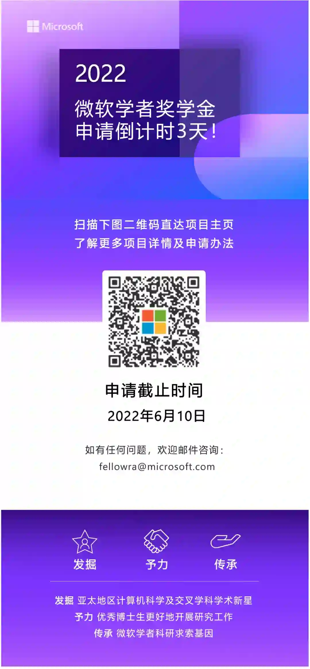 通过与2021年“微软学者”的对话,我们不难发现:青年从不缺少描摹未来的潜力,而“微软学者”奖学金的设立,正是一笔对青年人的投资。在过去的二十余年间,已先后有400多名优秀的博士生获得了“微软学者”称号,其中不少“微软学者”已经成为学术界的中流砥柱或工业界翘楚。未来,微软也将继续鼎力支持有潜力的学生,助力大家在科研的汪洋里,激起一朵朵浪花。