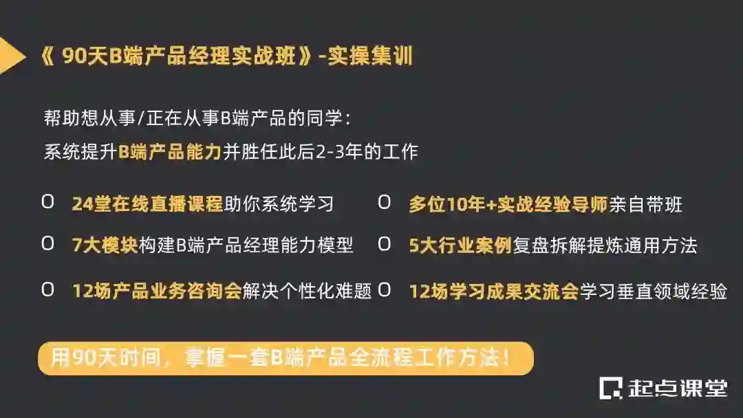 接下来,将为你详细介绍这门由腾讯课堂&起点课堂,在2020年联合打造的B端产品体系课——《90天B端产品经理实战班》。
