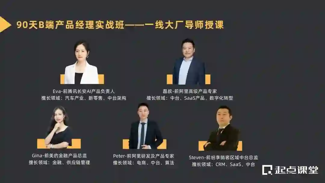 课程特邀多位10年+经验B端产品老司机,线上直播亲授。