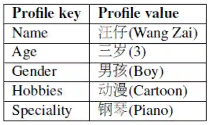 我们一起来看看这篇文章:首先,此文为闲聊机器人设定了固定的属性,包括但不限于姓名、性别、爱好等。这些属性被整理为 <Key, Value> 的形式,当机器人被问及与自身属性相关的问题时,应生成与自身属性相一致的回复。如下图所示:此文为 chatbot 设定为一个名叫汪仔的三岁男孩,他热爱动漫,特长是弹钢琴。