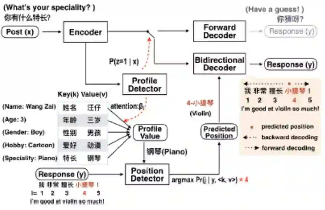 细节剖析:其中的编码器(Encoder)是将 post 编码成向量,以便后续深度生成模型利用。属性检测器(Profile Detector)在这里有两个目的:一是判断给定的 Post 是否涉及机器人自身的属性,二是判断涉及了哪一条属性,将检测到的属性 <key,value> 放入相应的解码器中。双向解码器(Bidirectional Decoder)的目的是生成一个涉及机器人属性的反应 (Response(y)),在测试阶段以机器人的属性值(Profile Value)为起点来生成整个序列。双向解码器这一点是受到了牟力立同学在 2016 年发表的一篇论文(Mou et al., 2016)[1] 启发,他们的工作是通过双向解码器生成包含限制条件的回复。与之不同的是,在训练过程中我们使用了 Position Detector 去预测关键词的位置,取代了(Mou et al., 2016)工作中随机替换关键词训练 Decoder 的方法。