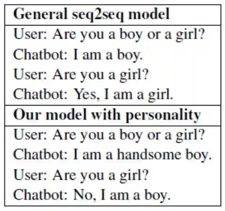 拥有“一致人格”的聊天机器人技术还十分不成熟,而对话中如果没有一致人格会出现什么问题呢?会对使用者来说产生什么困扰呢?举个例子,当你问某个 chatbot “你多大了?”,她可能会回复你“我啊……反正是九零后”,然后你接着问“你是九零后吗?”,她可能会回复“八零后”,非常直观。同样的问题想得到一致的回答,也就是将固定的只是或者人格整合进模型在目前看来其实是十分困难的,使用传统的 seq2seq 模型学习如何生成语义合理的回复,但它们没被训练如何生成一致回复的语义,因此在反复相同的语义输入时会出现不同的回复。