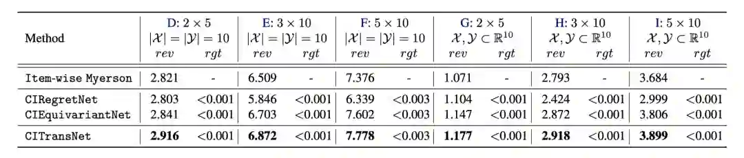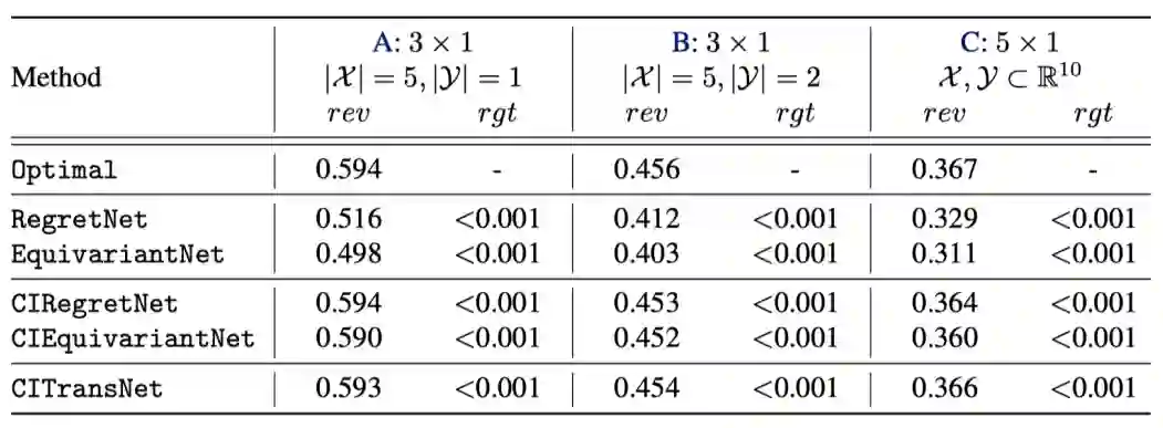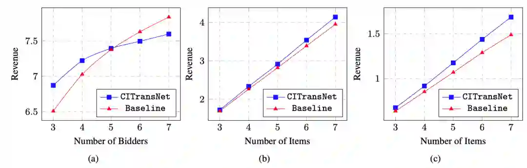 在这篇工作中,我们将基于深度学习的最优拍卖设计方法拓展到了上下文拍卖中。在上下文拍卖中,买家和商品都具备自己的上下文信息(即辅助信息,或者特征),并且买家对商品的估值分布同时依赖于双方的上下文信息。相比传统贝叶斯拍卖,这是一个更加贴近实际的问题场景。然后,我们为上下文拍卖设计了新的模型 CITransNet,这是一个集成了上下文信息的、基于 transformer 结构 [3] 的神经网络模型。该模型满足排列等价性并且网络规模与输入规模无关。我们通过实验验证了我们这套方法和模型在单物品以及多物品上下文拍卖场景下的有效性。