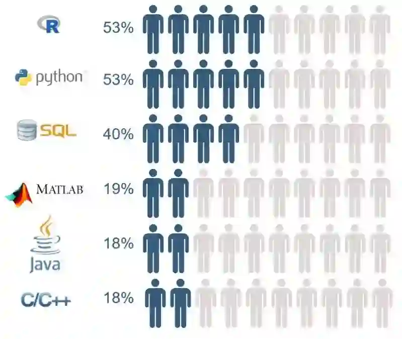 365 Data Science 收集了来自 LinkedIn 的 1001 数据科学家的信息,发现需求量最大的编程语言为 R 语言、Python 和 SQL。另外,还要求具备 MATLAB、Java、Scala 和 C/C++ 方面的知识。为了能够脱颖而出,需要熟练掌握 Weka 和 NumPy 这类工具。