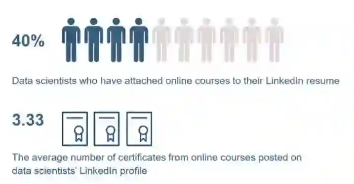 40% 的数据科学家参加过在线教育课程。另外,平均每人获得 3.33 个证书。所以,为了成为好的数据科学家,你需要通过参加在线课程、观看视频资料和获得 MOOC 证书的方式进行自学。