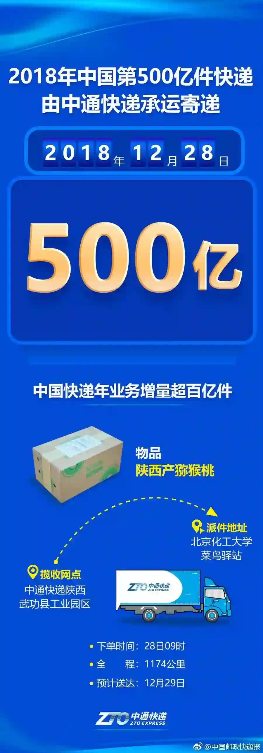 根据国家邮政局系统监测显示,今年的第 500 亿件快件是一箱来自陕西农村的猕猴桃,由中通快递承运,发件人是武功县工业园区内的一位水果电商,收件人是北京化工学院的一名大学生。