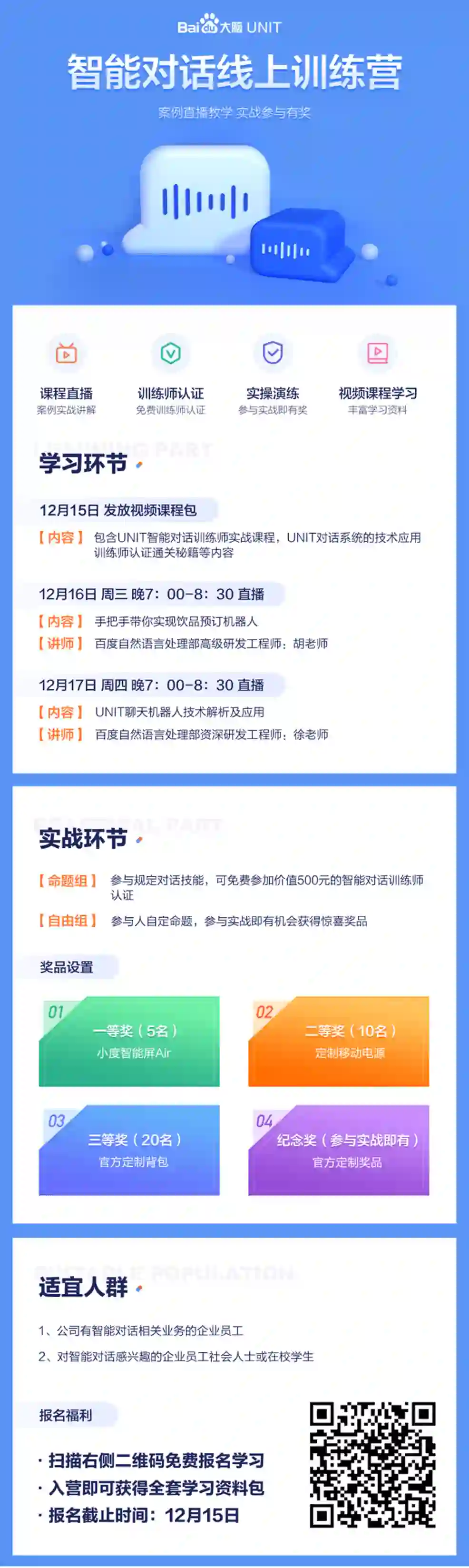 百度大脑UNIT不止是百度面向开发者推出的智能对话定制与服务平台,也是众多智能对话从业者和爱好者的一个实战平台。面向各种对话场景,提供对话/问答技能搭建、语料标注、对话流程管理、模型训练、服务部署等全流程功能,同时也向企业和开发者提供智能对话训练营,培训认证智能对话训练师。