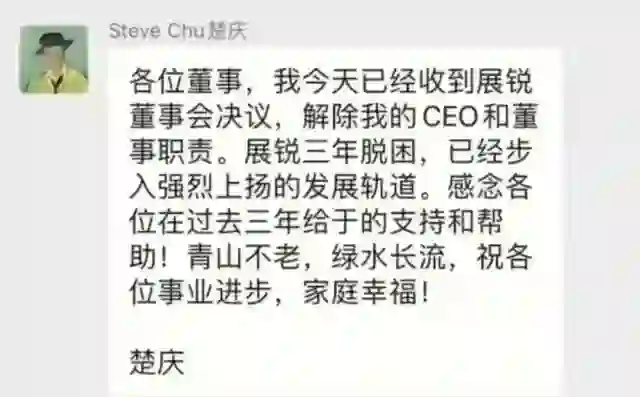 网上流传的一张疑似楚庆所在董事会的微信留言截图显示,楚庆表示,“已收到展锐董事会决议,解除其 CEO 和董事职责”。楚庆同时强调,在他任期内,“展锐三年脱困,已经步入强烈上扬发展轨道。”