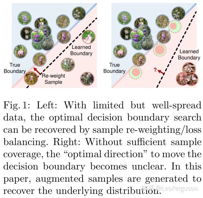 长尾分布带来的主要问题是在训练时,因为尾部类数据量少,统计信息不够丰富,因而模型并不能很好的表达尾部类。现有的方法主要有数据增广,下采样,过采样,和平衡损失函数的构建等。但是这些方法当尾部类数量极少时,性能并不理想。如下图所示。