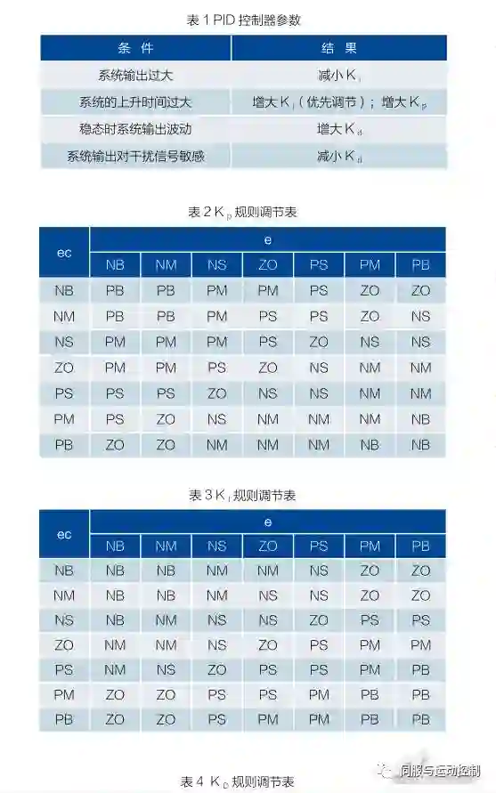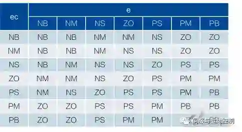 PID参数的设定是靠经验及工艺的熟悉,参考测量值与设定值曲线,从而调整Kp、Ki和Kd的大小。模糊控制规则是用于修正PID参数的,模糊控制规则根据过程的阶跃响应情况来考虑求取。规则如下所示: