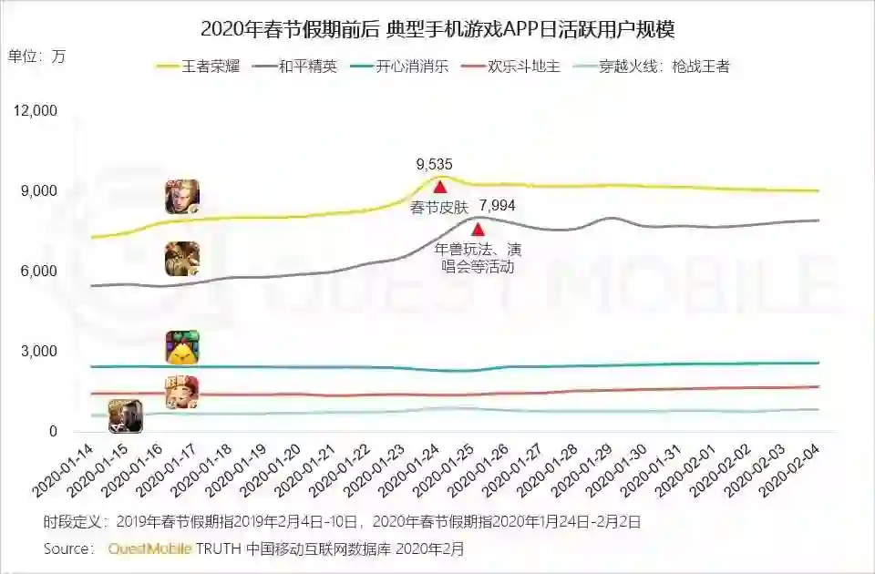 邦哥推荐:2月12日QuestMobile发布的调研数据显示,受疫情影响,最长假期、最宅春节诞生:日活跃用户规模、日均用户时长均创历史新高。不仅仅是《王者荣耀》,《和平精英》、《欢乐斗地主》等游戏的DAU,也在这个“假期”迎来的快速增长。