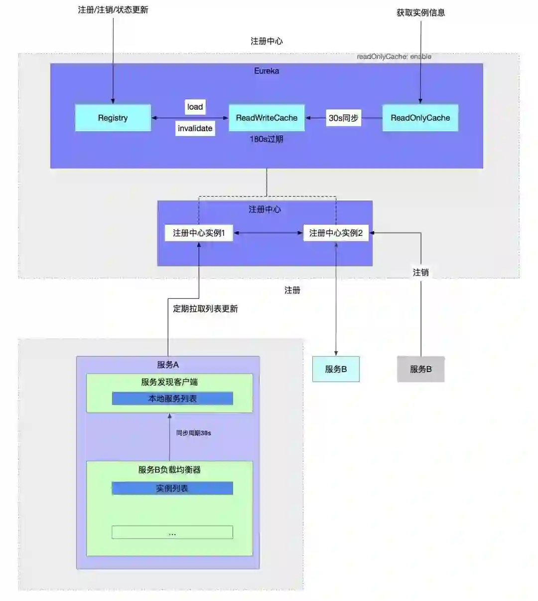 使用默认配置的情况下,实例正常上、下线的被发现延迟最大为 90s ,比如,服务 B(提供方)的一个实例上 / 下线,服务 A(调用方)在最长 90s 之后才会发现。这与 Netflix 的设计有关: