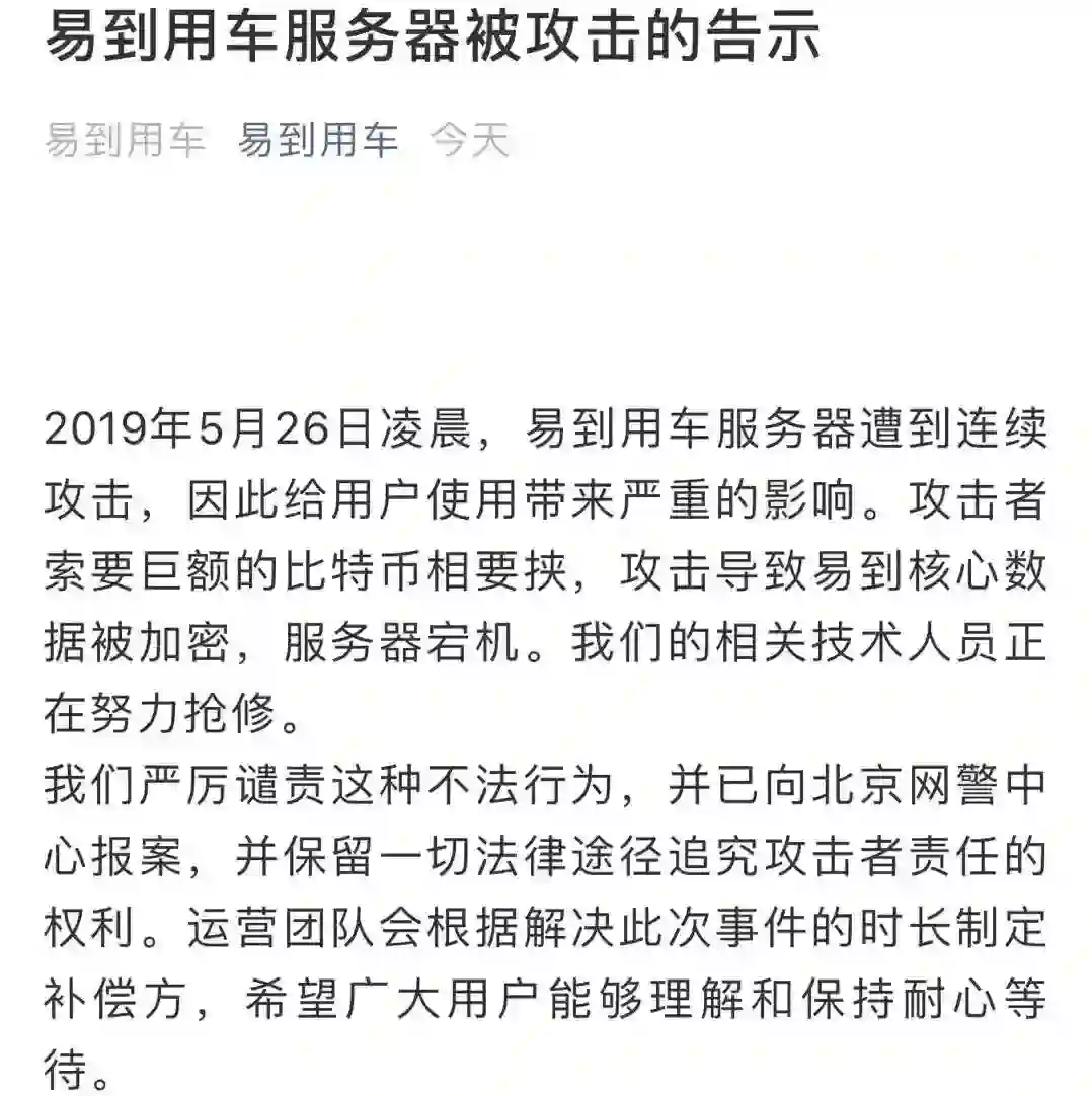 2019年5月26日凌晨,北京东方车云信息技术有限公司的易到用车官方微信发表被攻击告示。