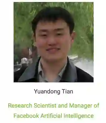个人简介:田渊栋,Facebook 人工智能研究院研究员/研究经理,重点研究深度强化学习及其应用、深度模型的理论分析等,是 ELF OpenGo 和 DarkForest Go 项目的负责人。在此之前,他 2013-2014 年曾在谷歌无人驾驶部门任研究员和工程师。