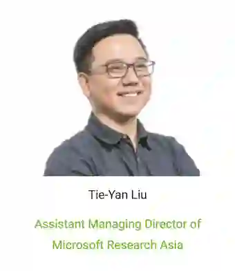 个人简介:刘铁岩,现任微软亚洲研究院副院长,IEEE 会士,ACM 杰出科学家,美国卡内基梅隆大学(CMU)客座教授,英国诺丁汉大学和清华大学荣誉教授。他曾担任过 WWW、SIGIR、KDD、 ICML、 NIPS、 IJCAI 以及 AAAI 等十几个国际学术会议的大会主席、程序委员会主席和领域主席,曾获得 SIGIR 2008 和 ACML 2018 最佳学生论文奖等颇具影响力的奖项。