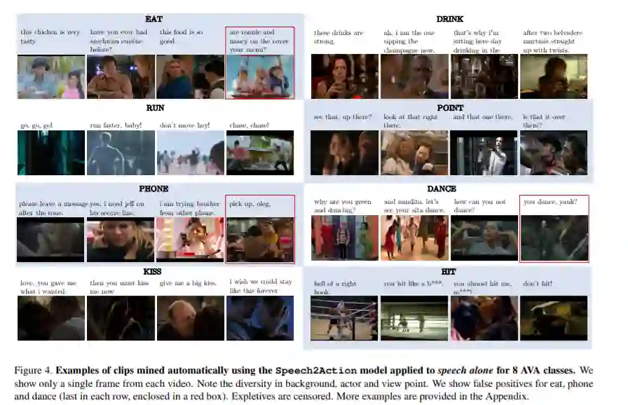 仅凭对话就能猜测人类行为吗?在这项工作中,我们调查了电影中的言语和动作之间的联系。我们注意到,电影剧本描述动作,也包含角色的语言,因此可以用来学习这种相关性,而不需要额外的监督。我们在一千多部电影剧本中训练一个基于BERT的语音动作分类器,从转录的语音片段中预测动作标签。然后,我们将该模型应用于一个大型未标记电影语料库的语音片段(来自288K电影的1.88亿个语音片段)。利用该模型的预测,我们得到了800K以上视频片段的弱动作标签。通过对这些视频剪辑的训练,我们在标准动作识别基准上展示了优越的动作识别性能,而无需使用一个手动标记的动作示例。