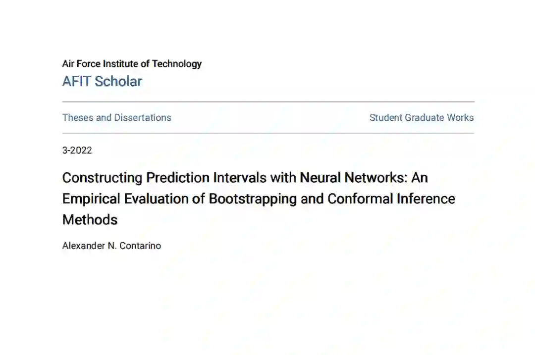 从自动驾驶汽车到智能手机上的面部识别技术,人工智能(AI)在其可扩展性和日常用途方面已经出现了爆炸性增长("人工智能与自动驾驶";Pascu,2021)。因此,美国防部(DoD)也对如何利用人工智能确保美国的国家安全产生了兴趣,这并不令人惊讶。事实上,2018年国防战略将人工智能的利用列为其关键的现代化优先事项之一(美国防部,2018:7)。为此,美国防部现在资助了600多个不同的人工智能项目,2022财年总额为8.74亿美元(OUSD(C),2021:3-2)。在广泛的人工智能技术类别中存在着神经网络,它是松散地基于人脑学习方式的学习算法(Goodfellow, Bengio, and Courville, 2016:165)。像其他监督学习算法一样,神经网络学习输入或特征数据如何与输出或目标数据的值相关联。神经网络的新颖之处在于,它们可以学习复杂的模式,而不需要像其他机器学习算法那样事先进行特征工程(Goodfellow, Bengio, and Courville, 2016:166)。神经网络已经成为一种流行的强大工具,目前最先进的网络在图像和面部识别任务中达到了人类水平的表现(He, Zhang, Ren, and Sun, 2015; Taigman, Yang, Ranzato, and Wolf, 2014)。尽管神经网络的潜力和应用令人振奋,但其预测的准确性与传统的回归技术有相同的局限性。具体来说,建模者假设目标变量是一些系统过程(可以通过回归算法学习)和随机误差(无法学习)的函数。因此,后者通常被称为 "不可减少的误差"(Gareth, Witten, Hastie, and Tibshirani, 2013:18)。因此,在回归估计中提供一些信心的衡量标准,如预测区间(PI),以量化这种不可减少的误差,往往是有帮助的。预测区间提供了一个值的范围,建模者认为未来的值将在这个范围内。预测区间的一个关键部分是它的置信系数,一般用百分比表示,当给定无限多的数据重样时,表明其准确性(Casella 和 Berger, 2002:418)。虽然有几种计算神经网络PI的方法,但建模者在区间的有效性和计算负担方面面临着权衡。分析方法,如最大似然法或贝叶斯技术,需要对数据的分布进行非简单的假设(Papadopoulos, Edwards, and Murray, 2001),这些分布通常不能通过神经网络来实现。此外,为了生成这些方法的PI,神经网络的训练是复杂的,并且由于重复计算梯度矩阵(即Hessian)而大大延长了训练时间(Khosravi, Nahavandi, Srinivasan, and Khosravi, 2015)。无分布技术,如自举和各种共形推理方法,消除了对大多数假设的需要,但仍有其自身的缺点。具体来说,自举的PI通常需要训练数百个甚至数千个模型。这通常是一个无法维持的任务,特别是对于时间和计算机内存受到限制的大型网络。例如,考虑一个由20个VGG-16架构组成的集合--最先进的神经网络,专门用于物体识别任务,对人脸数据集进行训练(Rothe, Tomofte, and Van Gool, 2015)。根据这些网络的大小("Keras应用"),该组合将占用超过10.5G的计算机内存。一些保形推理方法对从业者来说是一个潜在的有吸引力的选择。例如,归纳("拆分")和聚合保形预测法需要训练的模型比自举法少得多,也不会像分析性PI方法那样使网络训练复杂化。然而,这些方法产生的PI往往不如其他计算量更大的方法产生的PI信息量大(Cherubin, Chatzikokolakis, and Jaggi, 2021; Khaki and Nettleton, 2020)。此外,将保形推理用于神经网络仍然是一个相对较新的概念(Kivaronovic, Johnson, and Leeb, 2019),不同的参数在其应用中的效果仍然未知。例如,用内核密度估计(KDE)修改保形推理算法,显示出产生有利的PI的前景(Lei, Robins, and Wasserman, 2011),但在神经网络的背景下还没有被广泛地应用。因此,在使用PIs为神经网络预测提供信心方面存在着知识差距。具体而言,人们对神经网络的参数化如何影响PI的性能知之甚少。对于这些不同的PI方法在神经网络环境中的比较效用和性能也知之甚少,因为建模者必须在准确性、训练时间和计算机内存的权衡中做出决定。这种知识差距,加上神经网络的困难训练方法,导致PI很少被提供给网络的回归估计(da Silva Neves, Roisenberg, and Neto, 2009)。PIs的有限使用阻碍了民用和军用用户利用神经网络的全部优势,并延伸到人工智能。将置信水平与神经网络的预测联系起来,通过提供一个可能的数值范围,而不是单一的回归估计,增加了网络的可靠性和可用性(Papadopoulos, Edwards, and Murray, 2001)。可靠性是国防部的一个关键考虑因素,国防部试图将人工智能部署在对人的生命和设备有高度风险的情况下。例如,兰德公司调查了军事和人工智能专家,询问他们与军事人工智能相关的道德问题是什么,如果有的话(Morgan和其他人,2020:20)。两个最常见的担忧是,人工智能 "可能会犯危险的错误",或者军事领导人可能会对人工智能的产出 "过于信任"(Morgan and others, 2020:20)。这两种担忧都与人工智能的输出缺乏相关的信心措施有关。对这些问题的部分补救措施是改变这些人工智能的训练,以便在其基线输出之外提供PIs。然而,在做到这一点之前,需要更好地了解不同PI方法的比较性能,以及模型参数化如何影响这种性能。