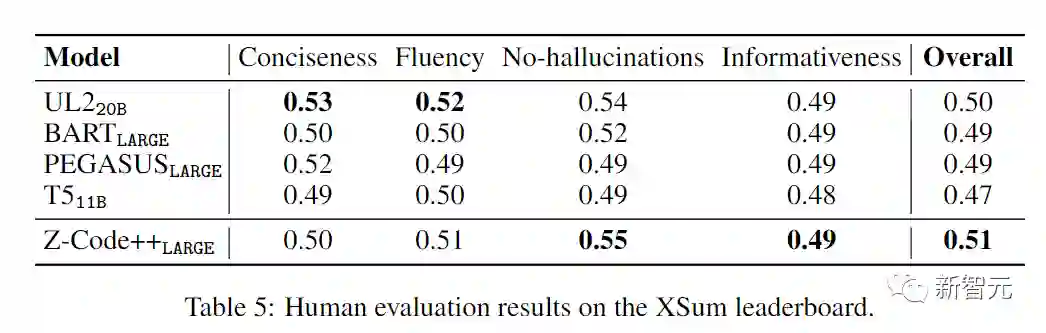 在XSum排行榜进行人工评价后,Z-coder++仍然从整体上来看是最高分,达到0.51