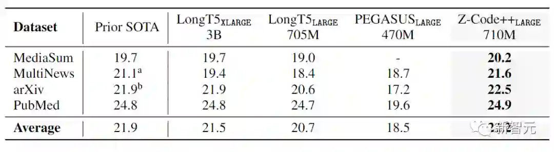 在长文本实验中,将Z-Code++与PEGASUS和LongT5进行比较后可以看到,Z-coder++依然是SOTA,并将平均最高分提升了0.35,而参数量还不到LongT5-3B的三分之一。