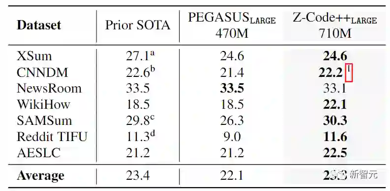 在实验部分,研究人员将Z-Code++和PEGASUS在7个具有代表性的标准公共英语摘要数据集上的性能进行比较,这些数据集的文档长度适中,包括AESLC、SAMSum、XSUM、WikiHow、NewsRoom、CNN/DailyMail(CNNDM),以及Reddit TIFU