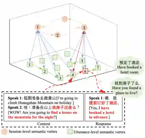 如图1所示,对话结构图有两类节点,分别是位于上层的捕捉了多轮会话级语义的会话级节点(图中橙色圆形节点),和位于下层的捕捉了话轮级语义的话轮级节点(图中绿色的方形节点)。进一步的,对话结构图有三类边,分别是连接连接两个会话级节点的Sess-Sess边、连接两个话轮级节点的Utter-Utter边以及连接一个会话级节点和一个话轮级节点的Sess-Utter边。
