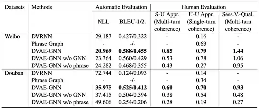 如表1所示,DVAE-GNN在两个数据集上的所有评估指标(显著性检验,p<0.01)上都显著优于基线DVRNN。这表明了DVAE-GNN模型能够更好地发现有意义的对话图。具体而言,DVAE-GNN在NLL和BLEU-1/2方面取得了最好的结果,表明了DVAE-GNN比DVRNN能够更好地捕获重要的语义信息。同时,DVAE-GNN在"U-U Appr"和"S-U Appr"指标上也超过了所有基线。结果表明,本文发现的对话图中的边具有较高的质量,能够更好地促进对话生成的多轮连贯性。
