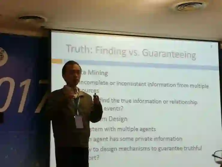 (3) 香港城市大学李闽溟副教授作了题为「Towards Truth: Mechanism Design vs. Data Mining」的特邀报告。他首先以 facility location games 为例,展示了如何通过机制设计以保证不说谎;然后以多源异构社交网络的事件挖掘为例,说明如何对不完全的或不一致的数据建立一个多维模型,以保证挖掘到真实的信息。