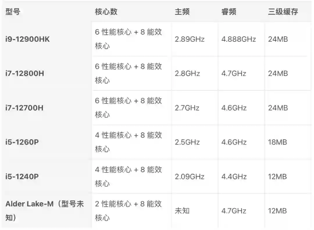 12 代酷睿桌面处理器已经上市,根据 CES 2022 的官网消息,英特尔将于拉斯维加斯时间 1 月 4 日上午 10 点(即北京时间 1 月 5 日凌晨 2 点)举行媒体发布会,届时英特尔很有可能发布 12 代酷睿移动处理器,包括用于游戏本和全能本的 H 系列、用于轻薄本的 P 系列以及用于平板及二合一设备的 M 系列。据可靠消息,英特尔将于 CES 展会发布的产品至少包含以下几款(数据仅供参考):