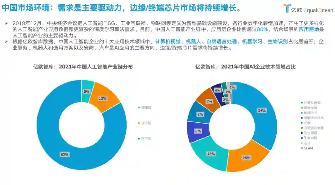 四大类人工智能芯片(GPU、ASIC、FGPA、类脑芯片)及系统级智能芯片在国内的发展进度层次不齐。用于云端的训练、推断等大算力通用 芯片发展较为落后;适用于更多垂直行业的终端应用芯片如自动驾驶、智能安防、机器人等专用芯片发展较快。超过80%中国人工智能产业链企 业也集中在应用层。
