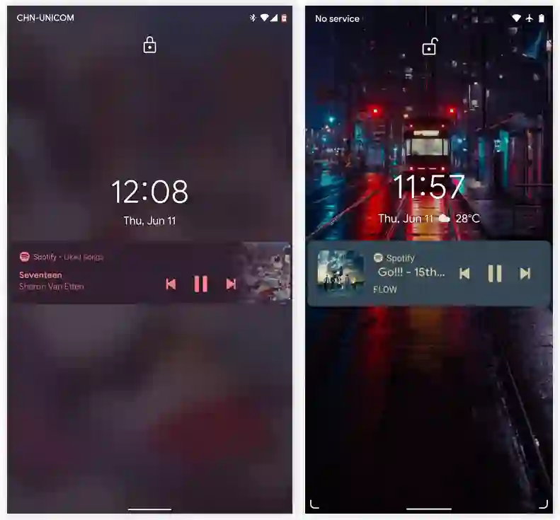 此外,锁屏状态下的音乐控制也发生了一些改变:在目前的 Beta 1 版本中,Android 10 自动使用专辑封面高斯模糊充当壁纸的设计不知为何消失了;同时锁屏部件中的专辑封面移动至左侧,增大了音乐控制键的大小。