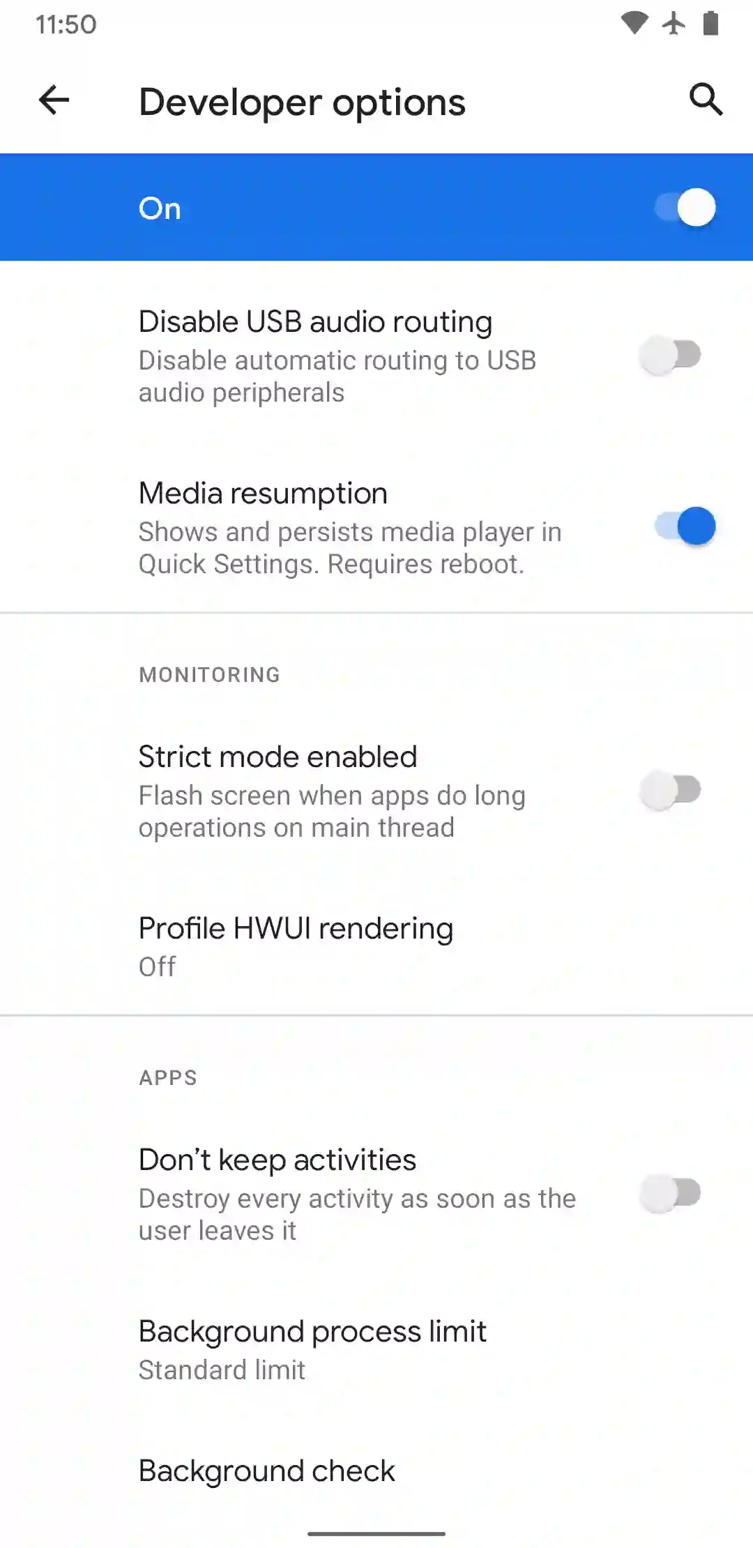 在 Android 11 Beta 中,这个新版本的控制中心也并非默认开启的,如果你想体验,需要在开发者选项中手动选择开启「Media resumption」并等待手机 UI 界面重启刷新。
