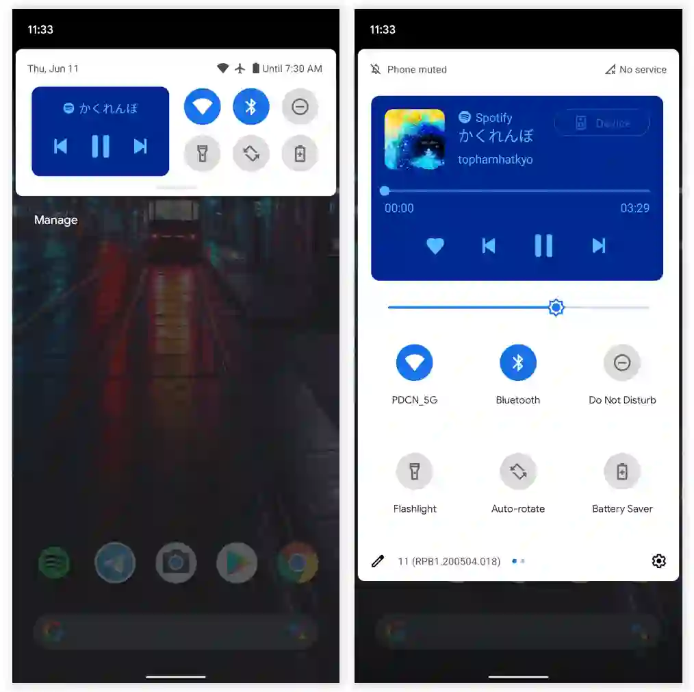 在开发者预览版就已经多次曝光、但一直没有正式整合进更新的通知中心的音乐控制部件,在本次 Beta 版本发布中也算是正式加入其中,与 Android 以往的媒体控制组件相比,新版本样式更加靠上(同时单手控制也变得更加困难了……)。