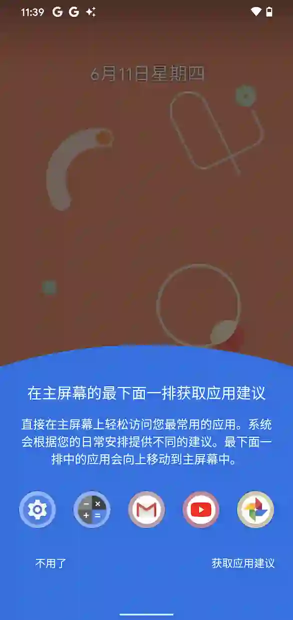 在首次设置 Android 11 时,桌面启动器便会提示你是否需要在主屏幕的最下面一排(Dock)获取人工智能加持下的应用建议。在开启后,系统推荐的应用会以带浅色外圈的样式出现以示区别。