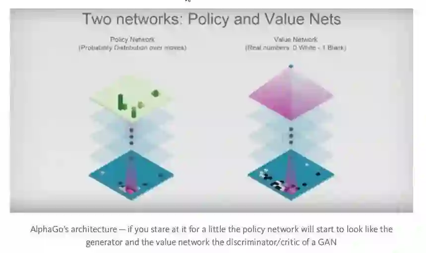 Deep‘ Mind公司用AlphaGo证明了深度对抗学习的厉害之处。在围棋比赛中,AlphaGo可以自己创造新的下法和招数。这开创了围棋的新纪元,突破了过去几千年的一个瓶颈,达到了新的高度。AlphaGo能做到这点是因为它能自己给自己打分,可以随时计算当前的局势的分数,而不用预先人工定义和预编程。这样,AlphaGo自己和自己下了几百万局的比赛。听起来很像对抗学习吧?