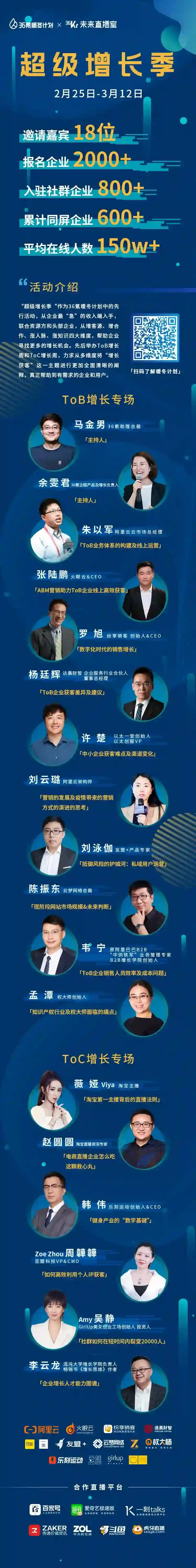 2月25日,为了帮助中小企业解决增长获客的需求,36氪暖冬计划正式推出了超级增长季,在半个月的时间里分别策划了B端获客增长周和C端获客增长周,每周举行三场增长获客的专场分享活动,邀请获客平台、行业专家和投资人为企业分享增长获客解决方案、并送来专享企服大礼包。
