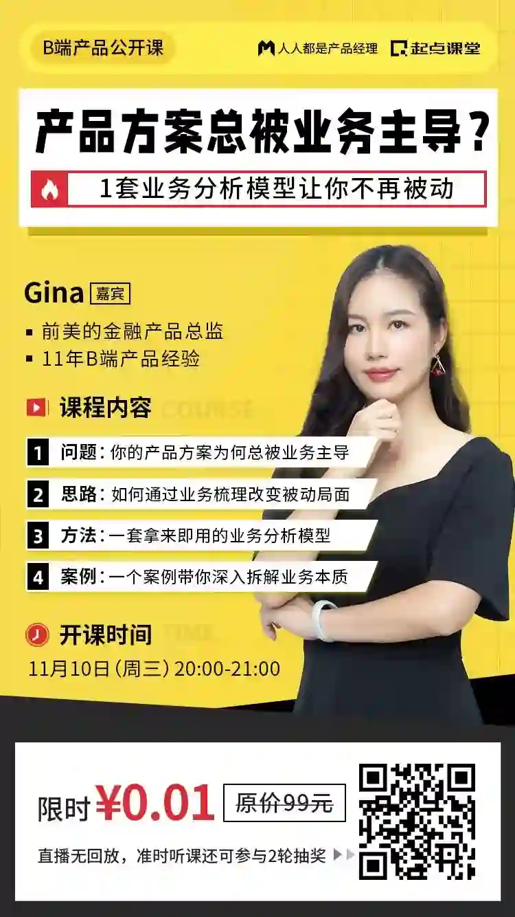 这是由起点课堂(原起点学院)出品的B端产品公开课,专为正在做B端产品同学,或者对B端产品感兴趣想要了解相关工作内容的同学打造,课程将由前美的金融产品总监@Gina老师直播授课。