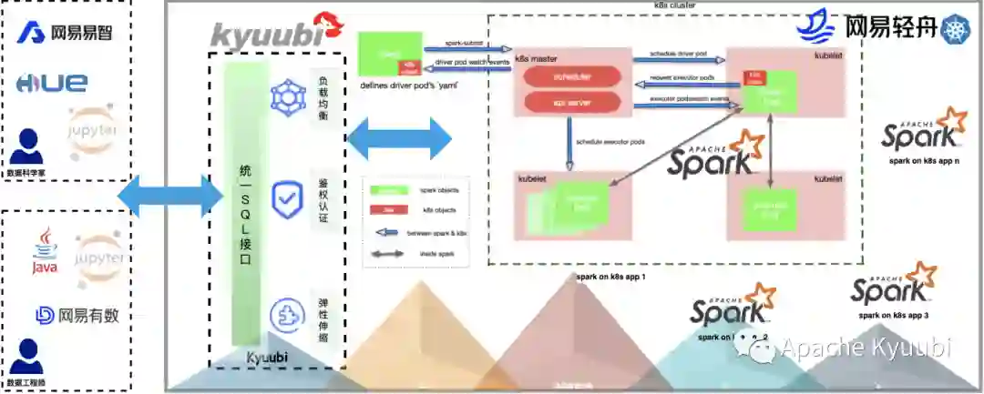 当然,无论是 Spark 原生的还是 Operator 的方式,对大部分用户来说还是太原始了,不可避免的需要去感知一些底层的细节。在 Datalake/Lakehouse 场景下,数据变得民主,数据应用变得多样,很难去大范围地推广。在易用性上想更进一步,可以考虑使用 Apache Kyuubi (Incubating)[7]来构建 Serverless Spark/SQL 服务。大部分情况下,用户都可以直接使用 BI 工具或者 SQL 来直接操作数据即可。
