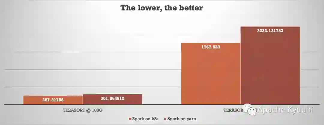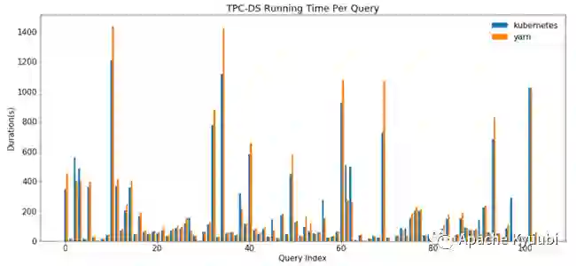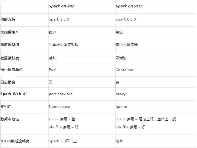 从原理上,无论是 Kubernetes 和 YARN 都只起资源调度的作用,不涉及计算模型和任务调度的变化,所以在性能上的差异应该是不显著的。从部署架构上,Spark on Kubernetes 一般选择存算分离的架构,而 YARN 集群一般和 HDFS 耦合在一起,前者会F在读写 HDFS 时丧失“数据本地性”,这个由于网络带宽因素影响可能会影响性能。从存算耦合架构诞生之初经过 10 年左右的发展,随着网络的性能增长,各种高效的列式存储格式及压缩算法的加持,这点影响微乎其微。