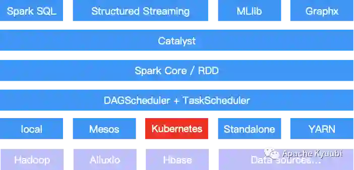 从 Spark 整体计算框架层面来看,只是在资源管理层面多支持了一种调度器,其他接口都可以完全复用。一方面 Kubernetes 的引入和 Spark Standalone、YARN、 Mesos 及 Local 等组件形成了一个更为丰富的资源管理体系。
