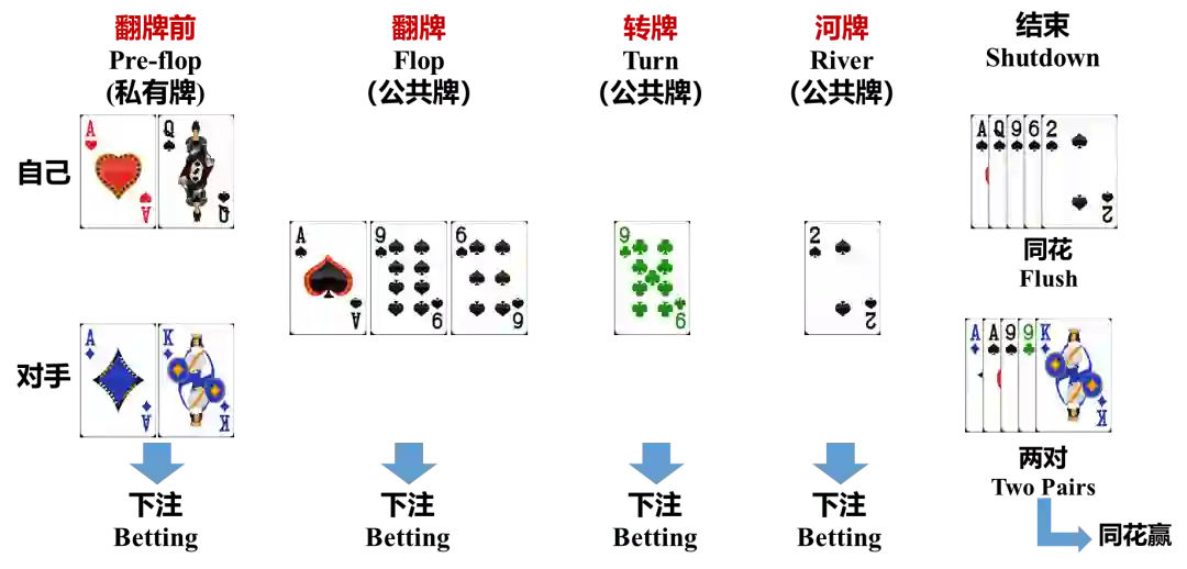 图1展示了一场德州扑克游戏的完整流程示意。经过四轮押注之后,若仍不能分出胜负,游戏进入「摊牌」阶段,所有玩家亮出各自底牌并与公共牌组合成五张牌,成牌最大者获胜。图2给出了德州扑克不同组合的牌型解释和大小。