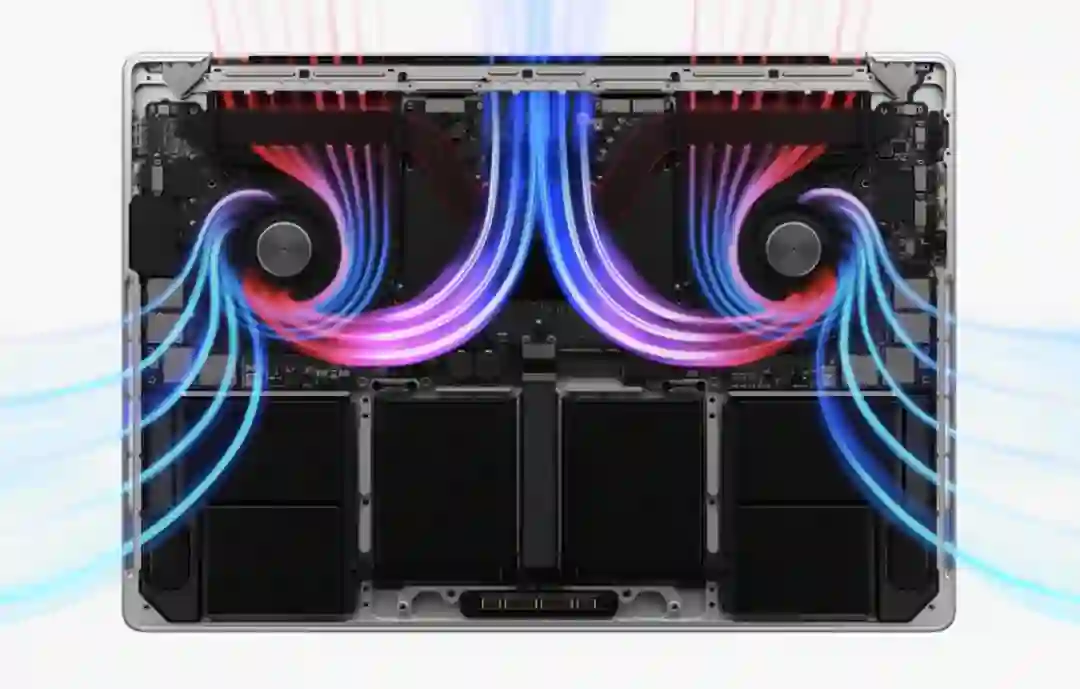 14 英寸和 16 英寸 MacBook Pro 机型拥有焕然一新的精美外观,其设计专注于性能与实用性。全新铝金属外壳优化了内部空间,以实现增强的性能与更多的功能。机身围绕先进的散热系统进行精密制作,即便在低风扇转速下,排风量也比上一代机型多 50%。这一散热设计让 MacBook Pro 在提供强大而稳定的性能表现的同时,仍能保持冷静运行。