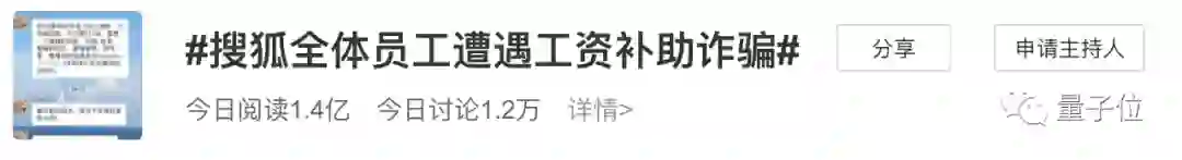 今天上午,一则名为“搜狐全体员工遭遇工资补助诈骗”的消息冲上热搜,阅读量约1.4亿。